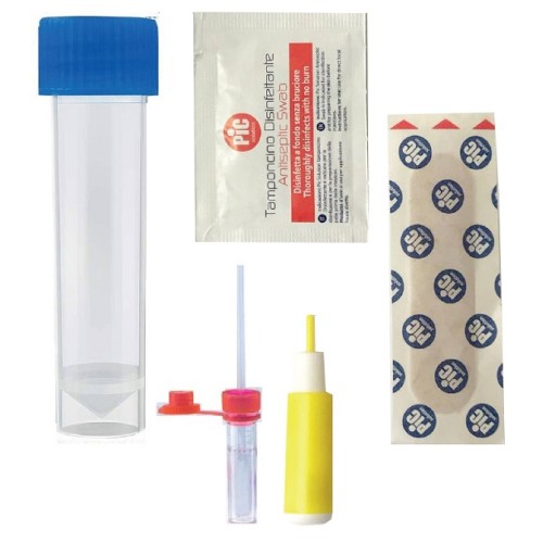 Provetta di raccolta con capillare in plastica, porta provette, cerotto, salvietta disinfettante, lancetta pungidito, provetta di sicurezza, foglio informativo sulla privacy, questionario, istruzioni per l’uso.